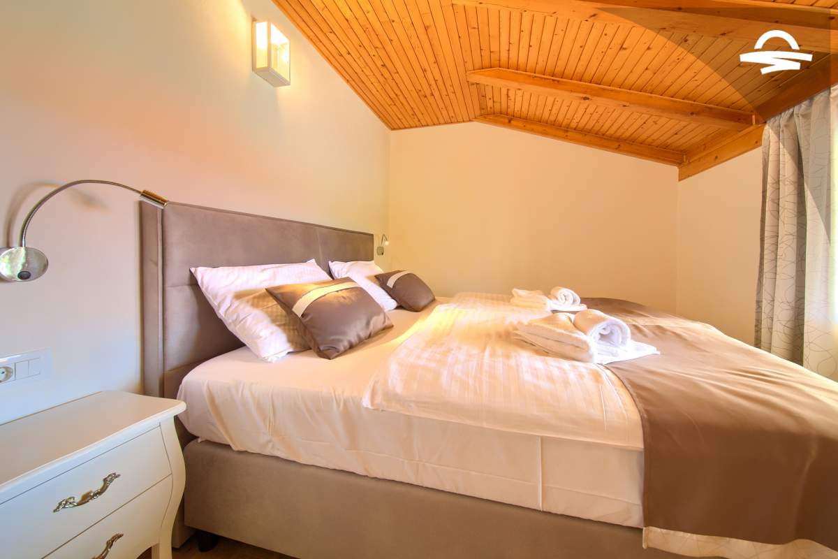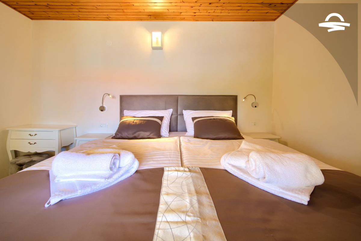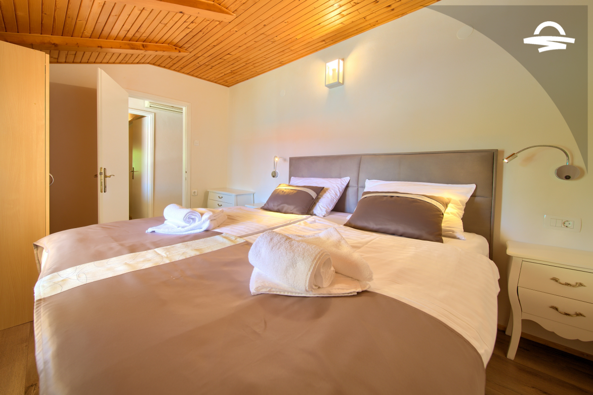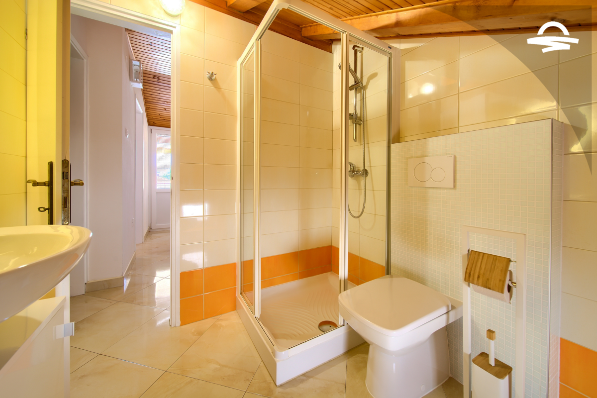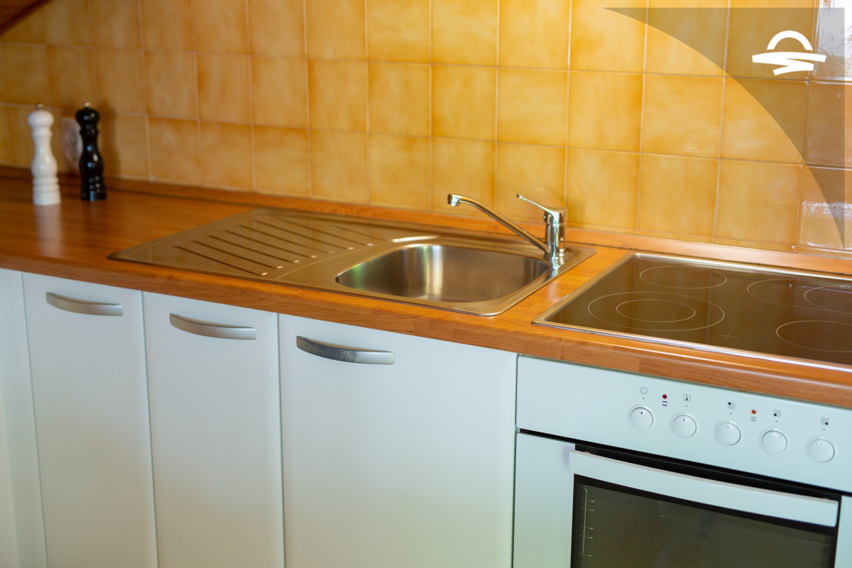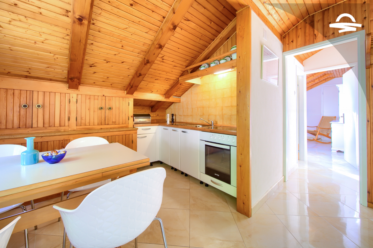 L'appartamento ha 60 m2 e può ospitare 4-5 persone. Si compone di una cucina ben attrezzata e soggiorno, due camere doppie, un bagno con doccia, e un balcone di 12 m2.