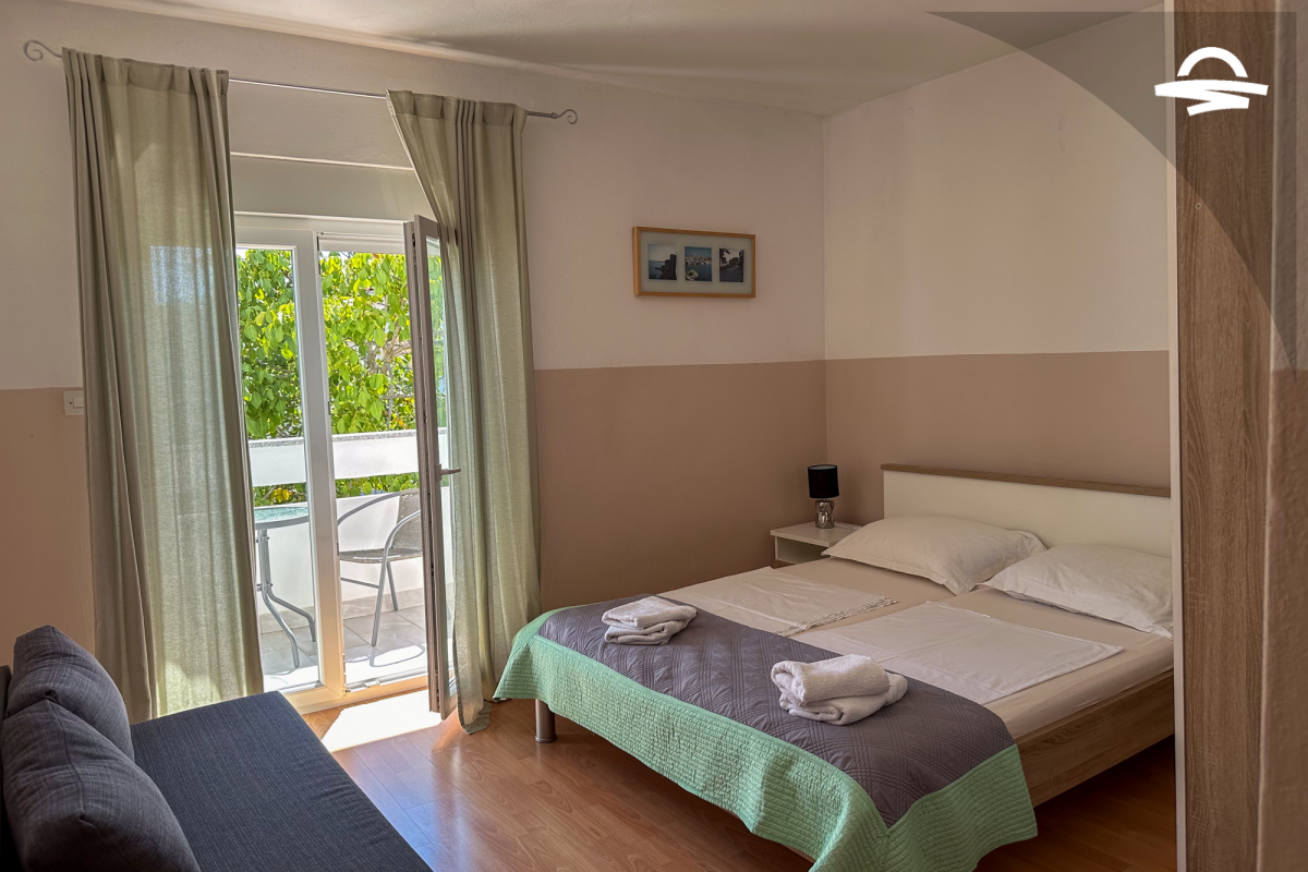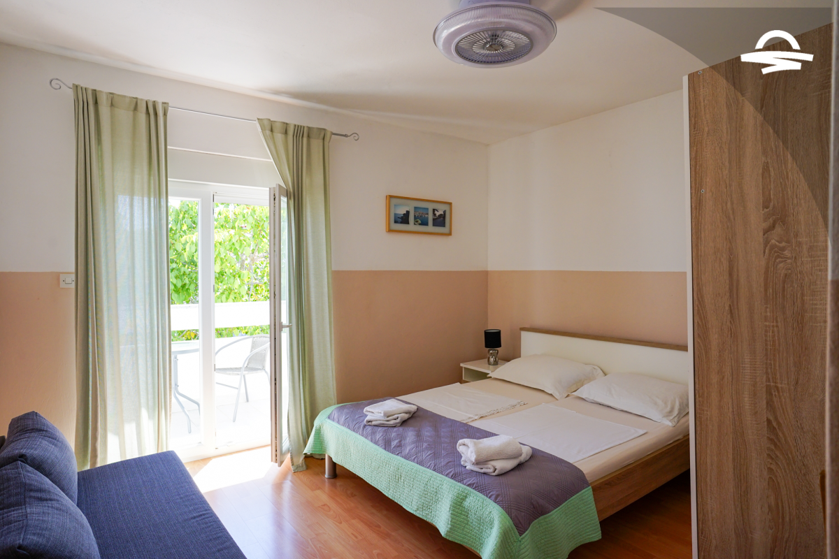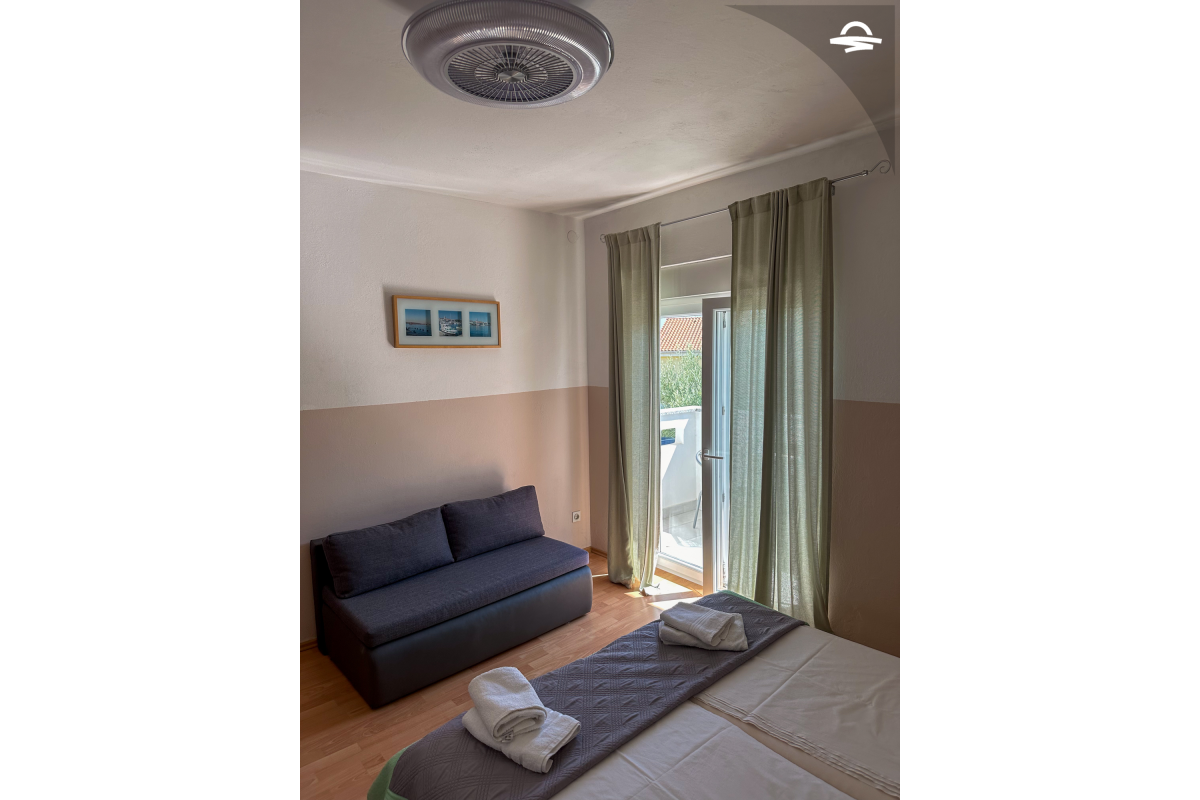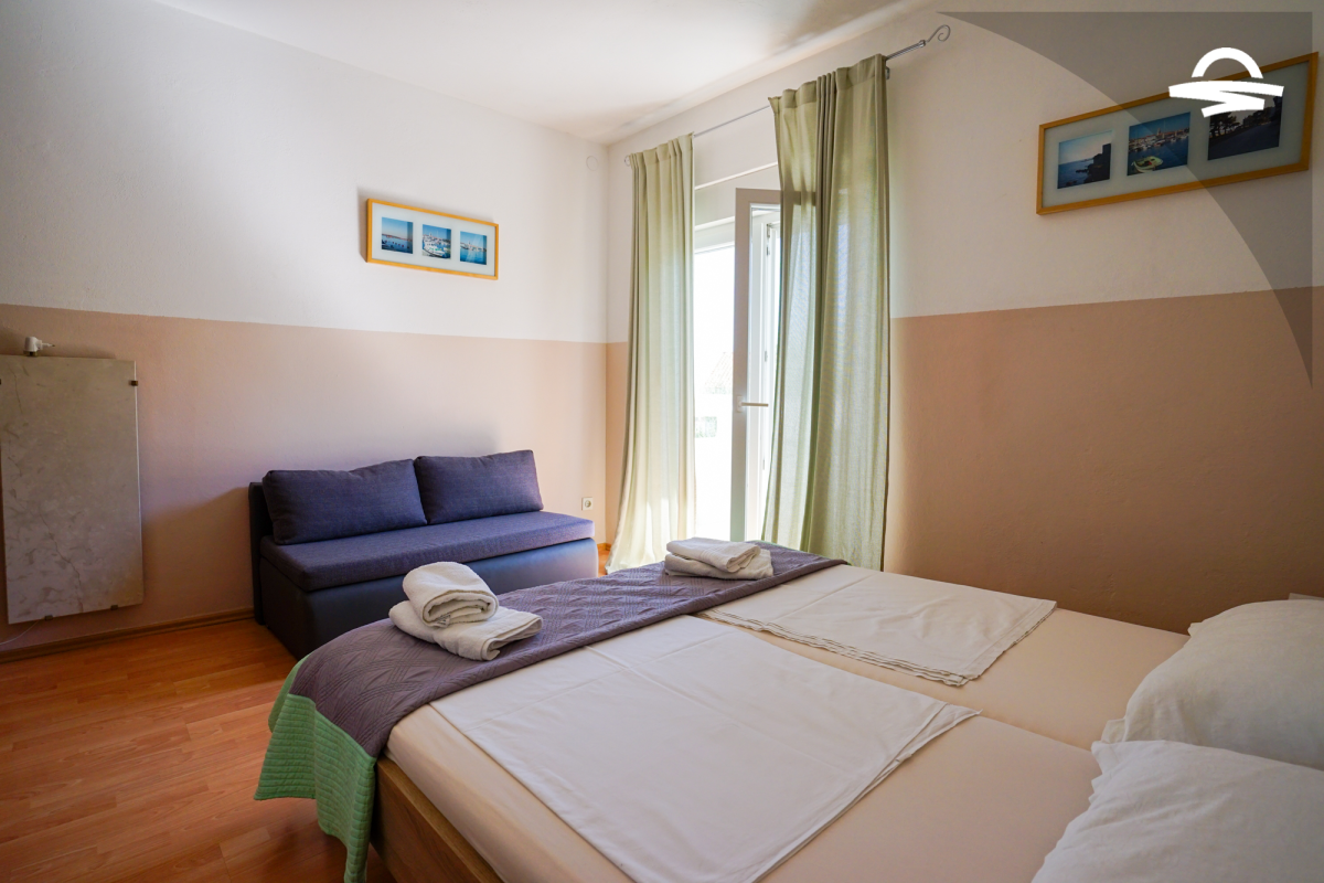 Spazioso appartamento Barica 2 si trova al primo piano di una casa privata. Questo appartamento di 72 m2 può ospitare 4-5 persone. Si compone di una cucina e soggiorno, una camera tripla, una camera doppia, due bagni con doccia ed un balcone di 16 m2.