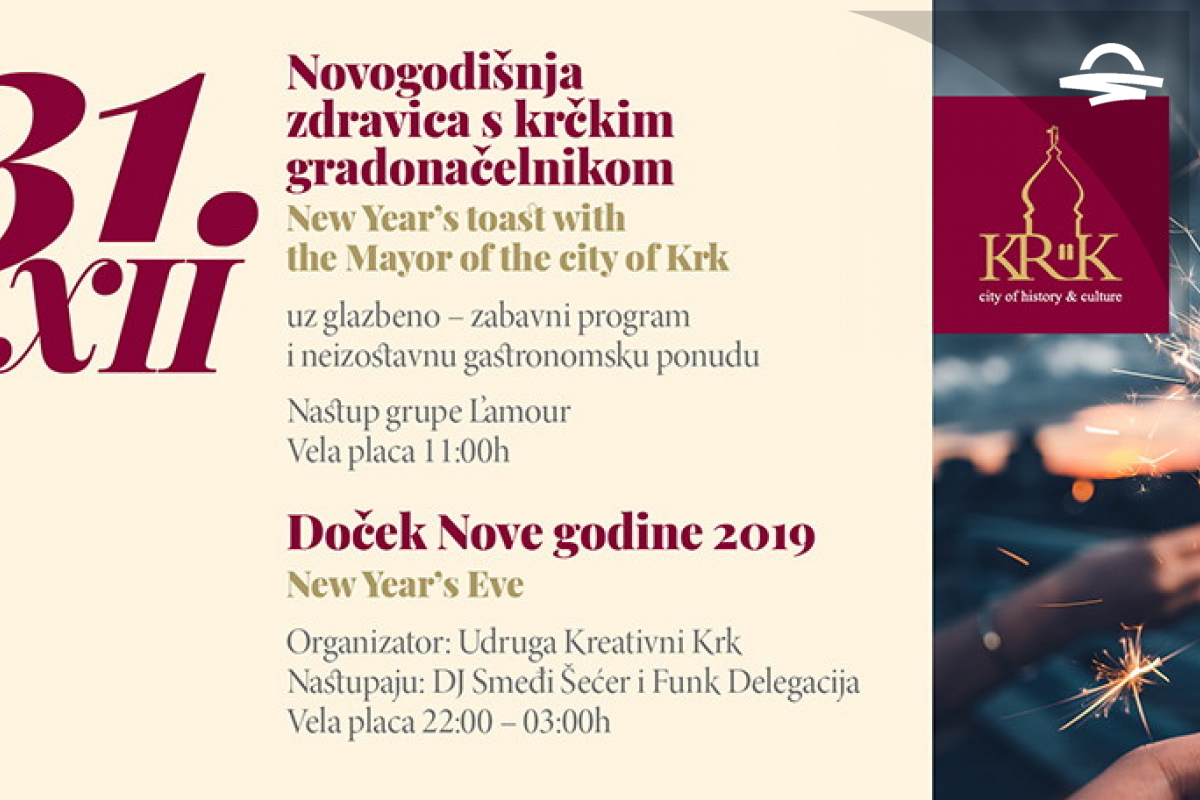 Festeggia l'ultimo dell'anno nel cuore della città vecchia, in piazza Vela Placa! Il programma, organizzato dall'associazione Kreativni Krk, inizia con una nota band L'amour alle 11.00, mentre il brindisi e il discorso di Capodanno saranno tenuti dal sindaco di Veglia a mezzogiorno. Non aver paura della fame e della sete perché un'offerta gastronomica di un'intera giornata è una parte inevitabile del programma. Saluteremo il 2018. con i ritmi di DJ Smeđi Šećer e Funk Delegacija, che ti intratterranno dalle 22.00 alle 3.00 del 2019.