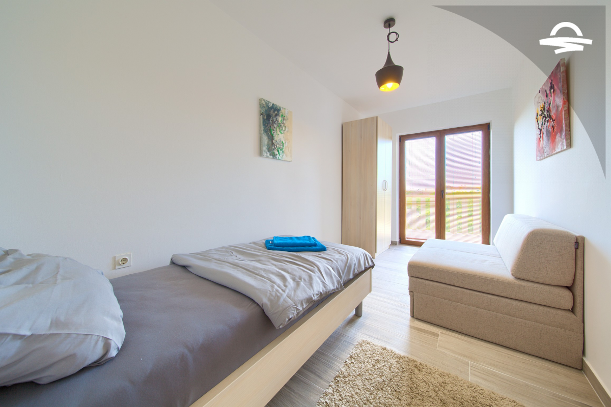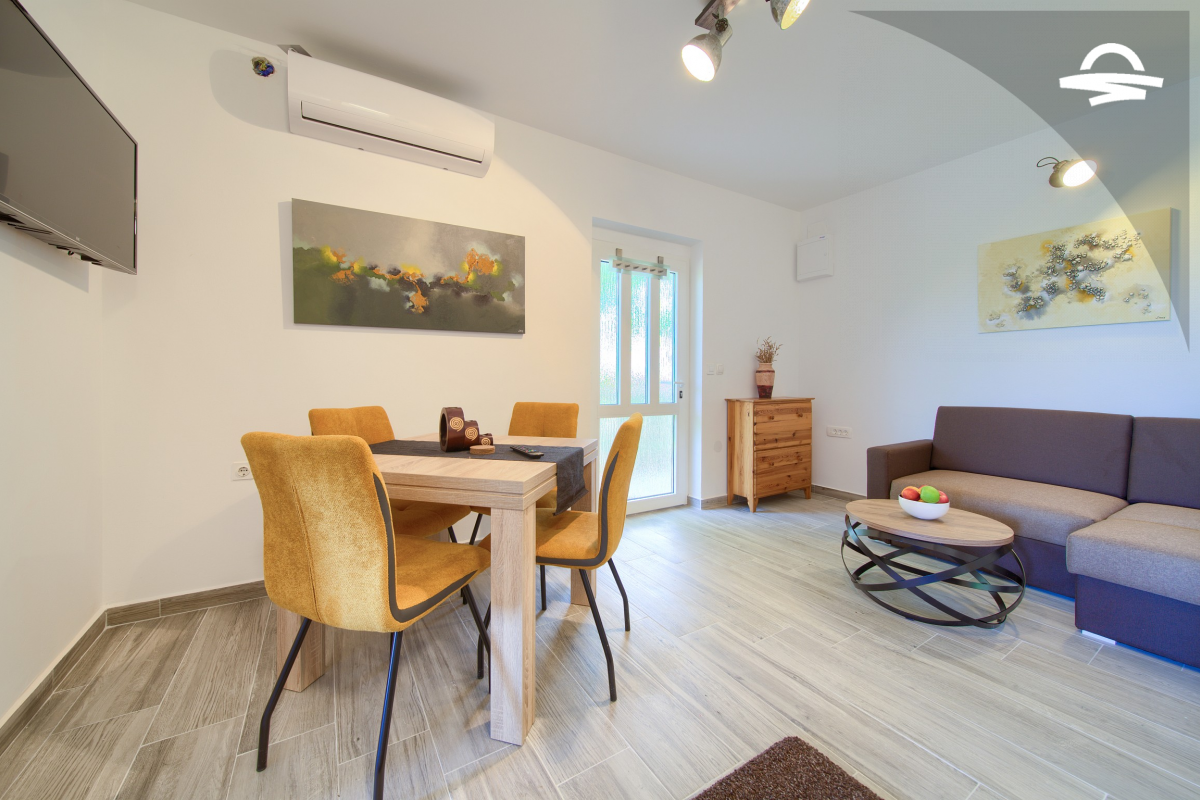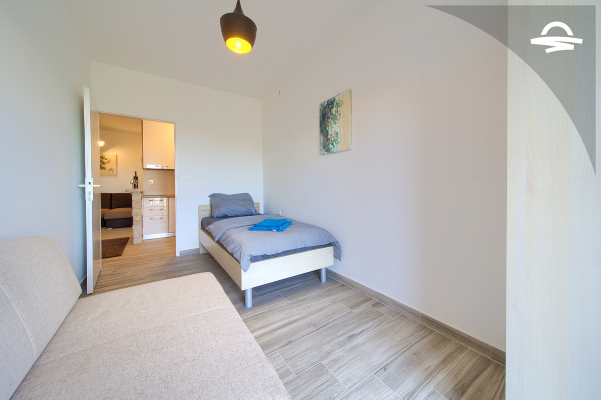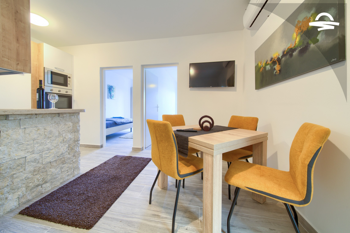 Appartamento di nuova costruzione e moderno per 2-3 persone. Ci vogliono circa 5 minuti per il centro città, mentre la spiaggia più vicina "Porporela" è a circa 600 m dall'appartamento. L'appartamento è composto da soggiorno, cucina, bagno e 2 camere da letto, una con letto matrimoniale e l'altra con un letto singolo e un divano che può essere utilizzato come letto aggiuntivo. È inoltre possibile rilassarsi su un ampio balcone e godersi la vista sul mare.